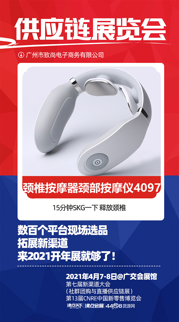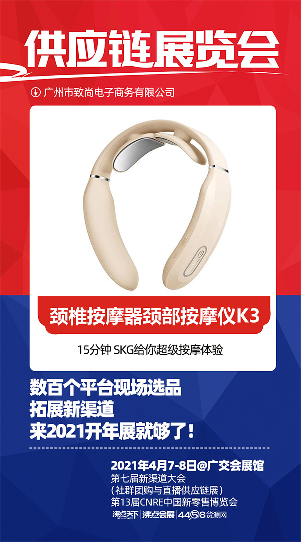 由沸点天下、沸点会展、4458货源网联合举办的“2021第七届新渠道大会(社群与直播供应链展)、第13届CNRE中国新零售博览会”将于2021年4月7日在广州举办,深圳致尚电子商务有限公司携SKG系列产品受邀参展!